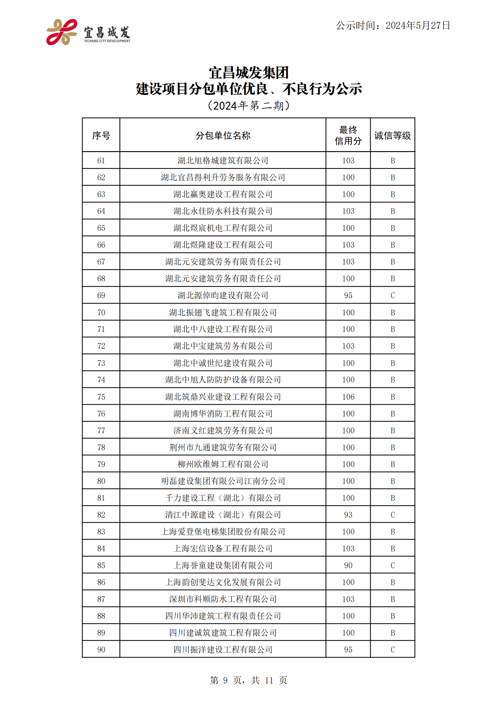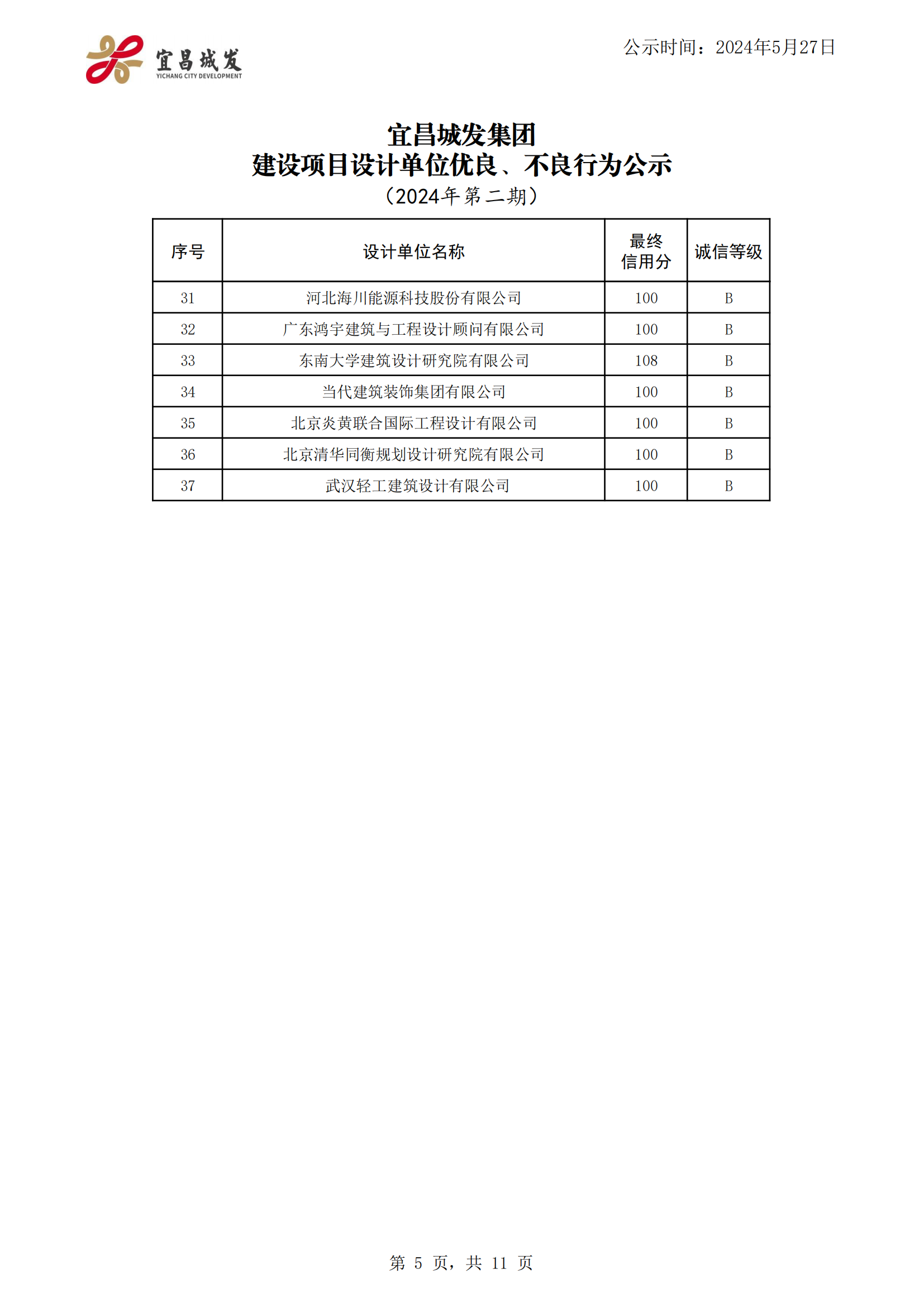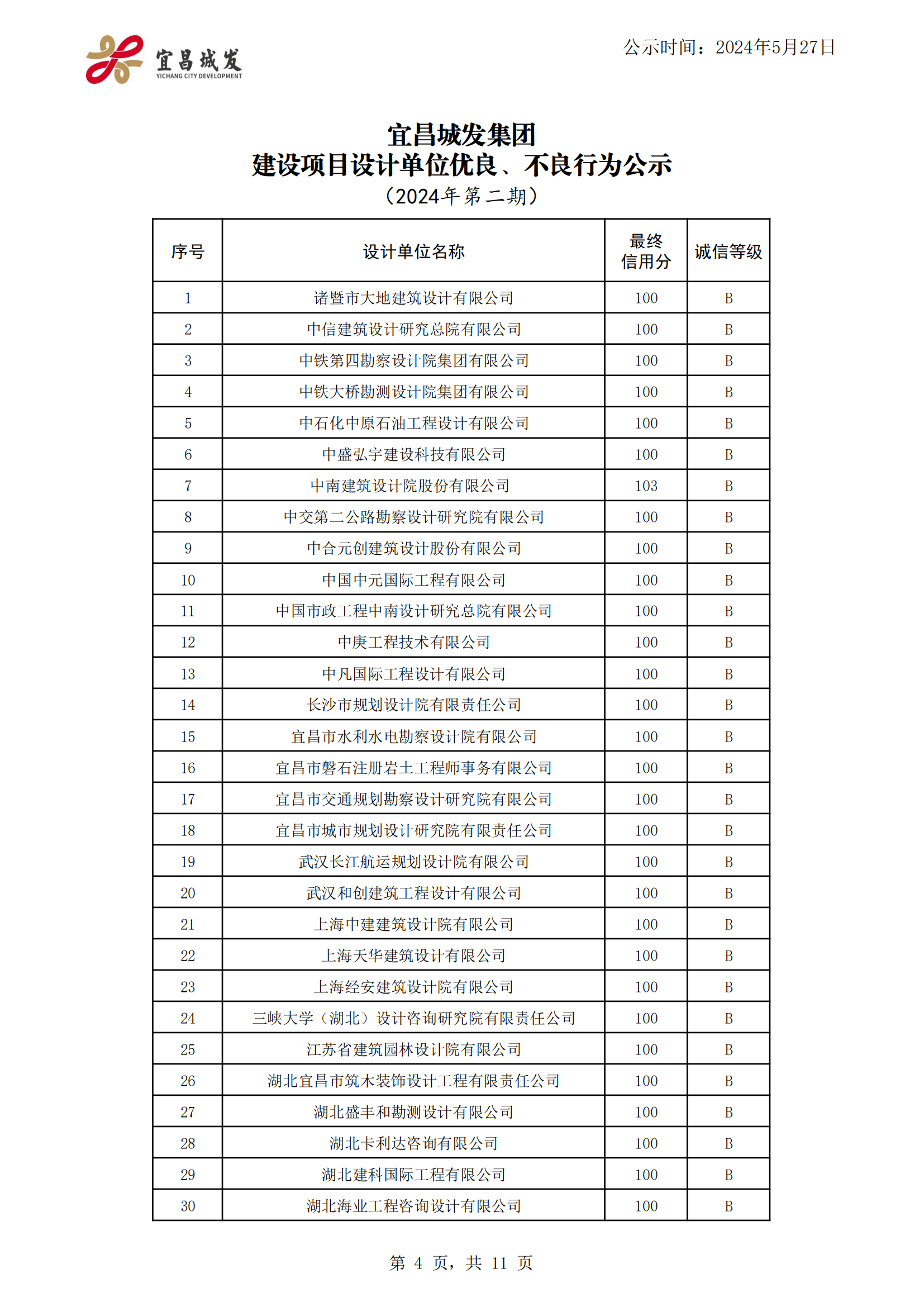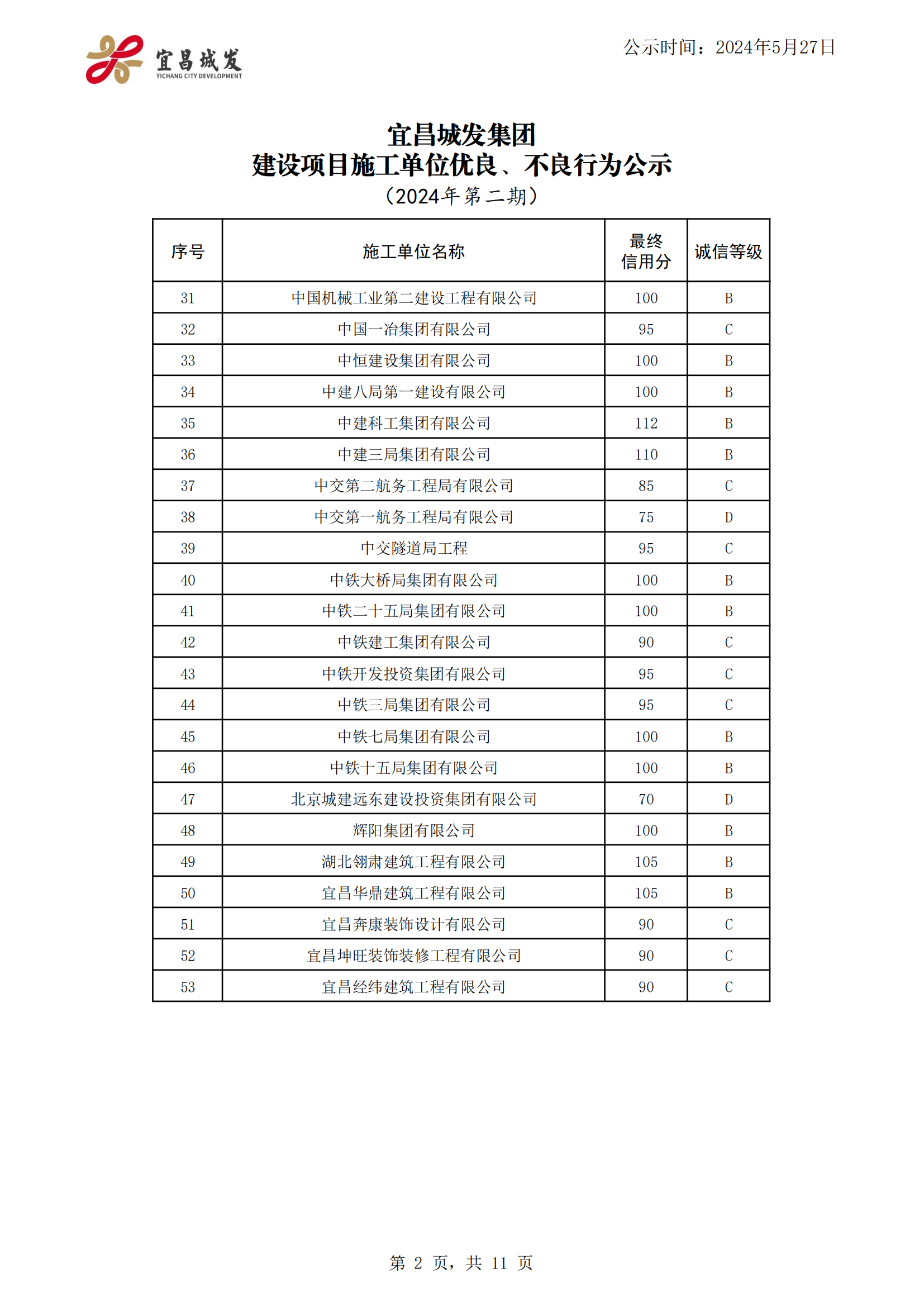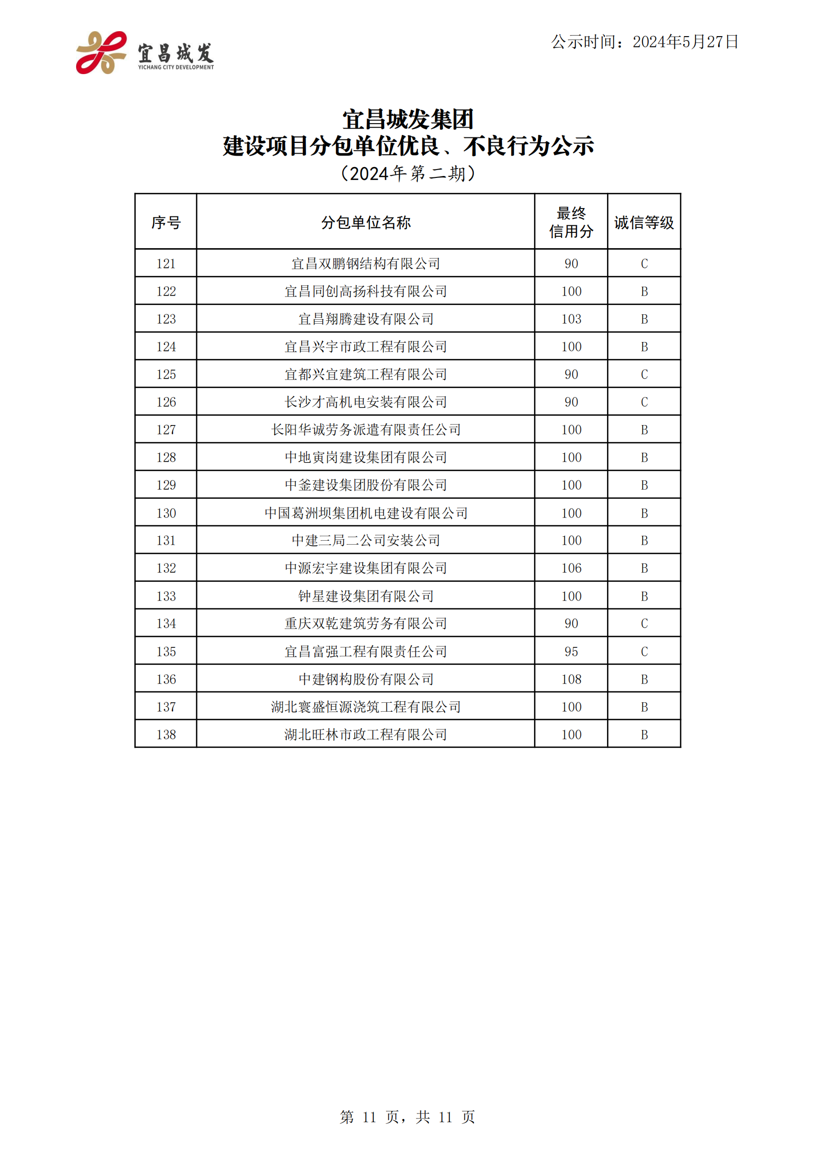 宜昌城发集团建设项目合作单位优良、不良行为公示 (2024年第二期)