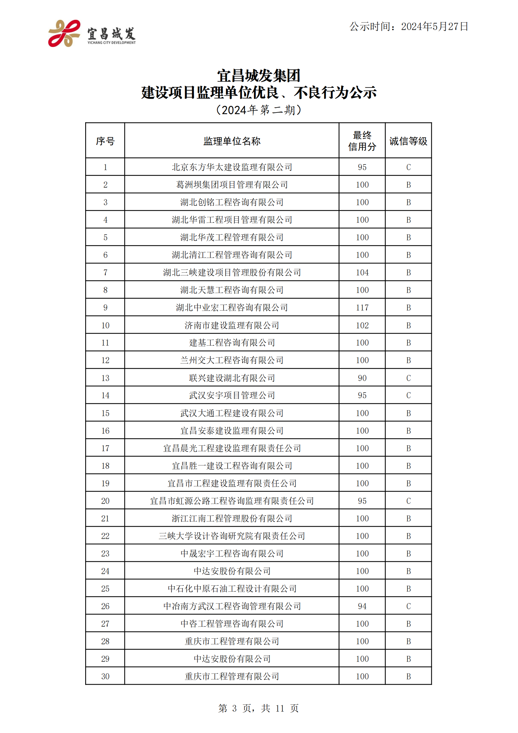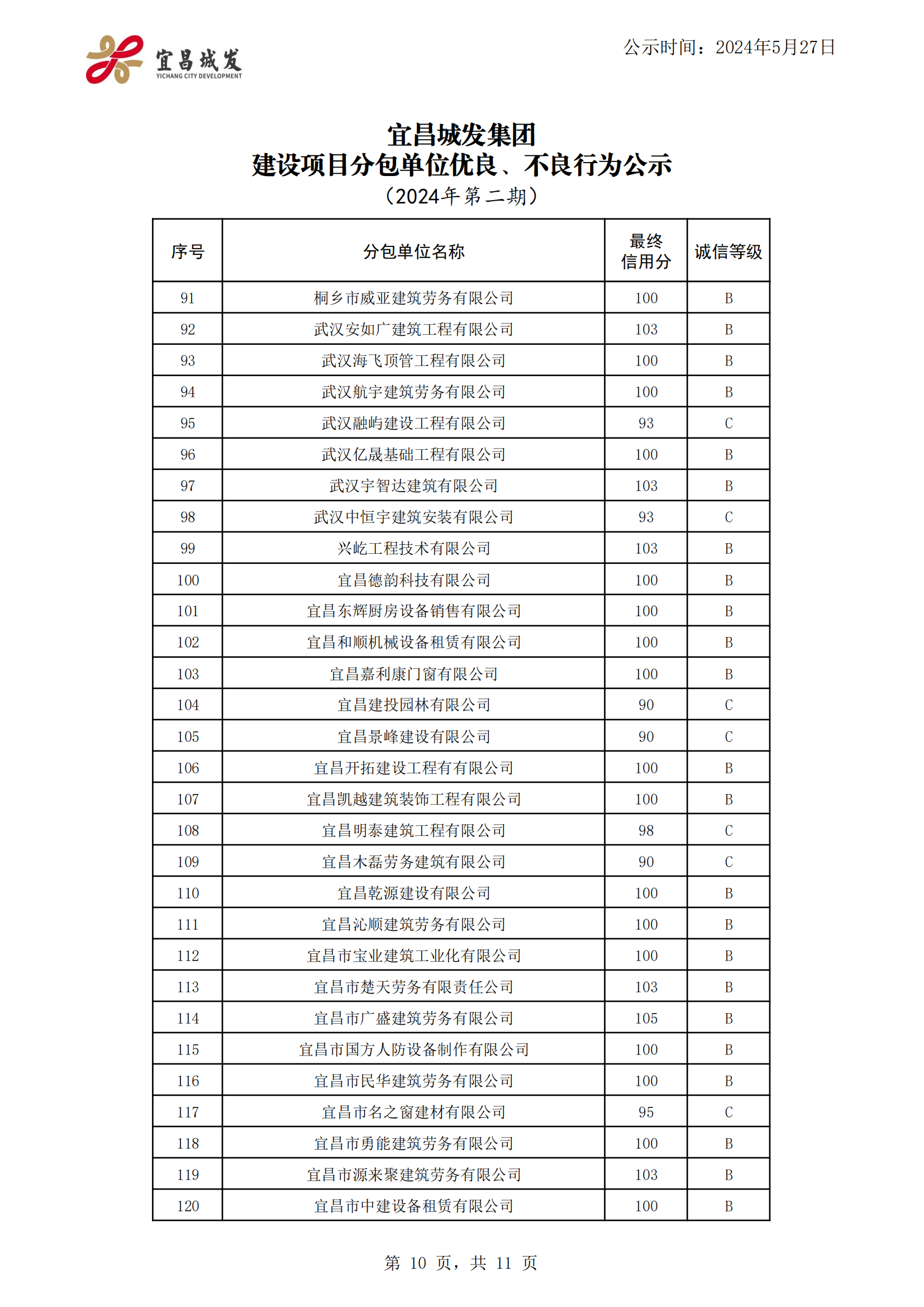 宜昌城发集团建设项目合作单位优良、不良行为公示(2024年第三期)
