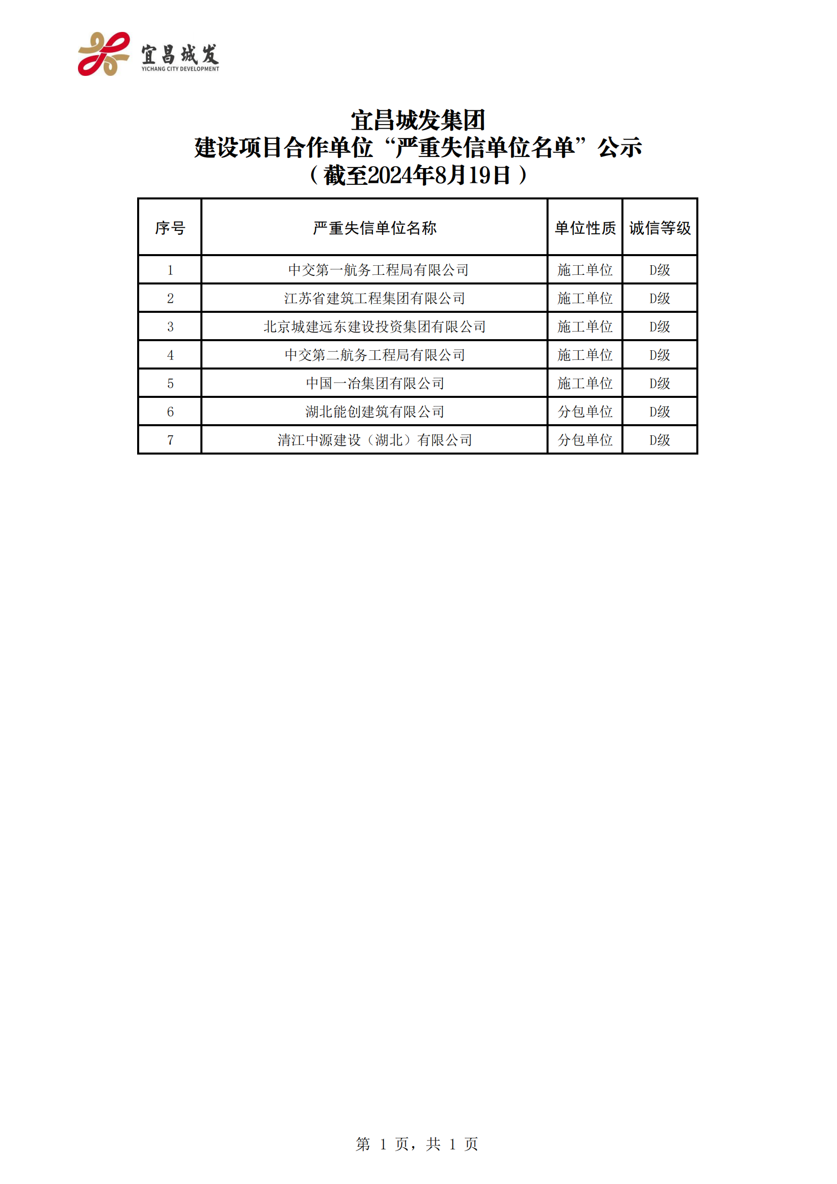 宜昌城发集团建设项目“严重失信单位名单“公示(截至2024年8月19日)