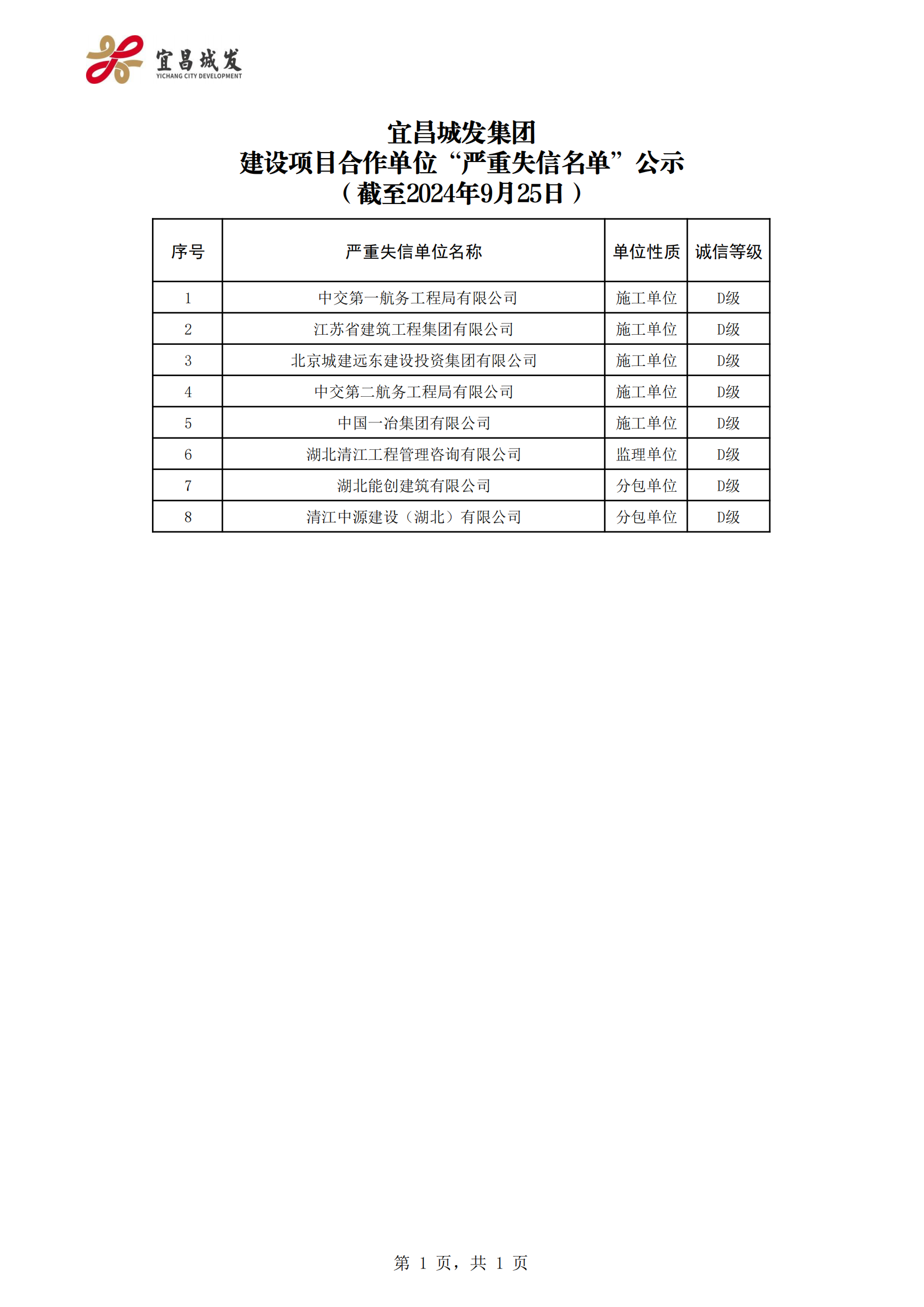宜昌城发集团建设项目“严重失信单位名单“公示(截至2024年9月25日)