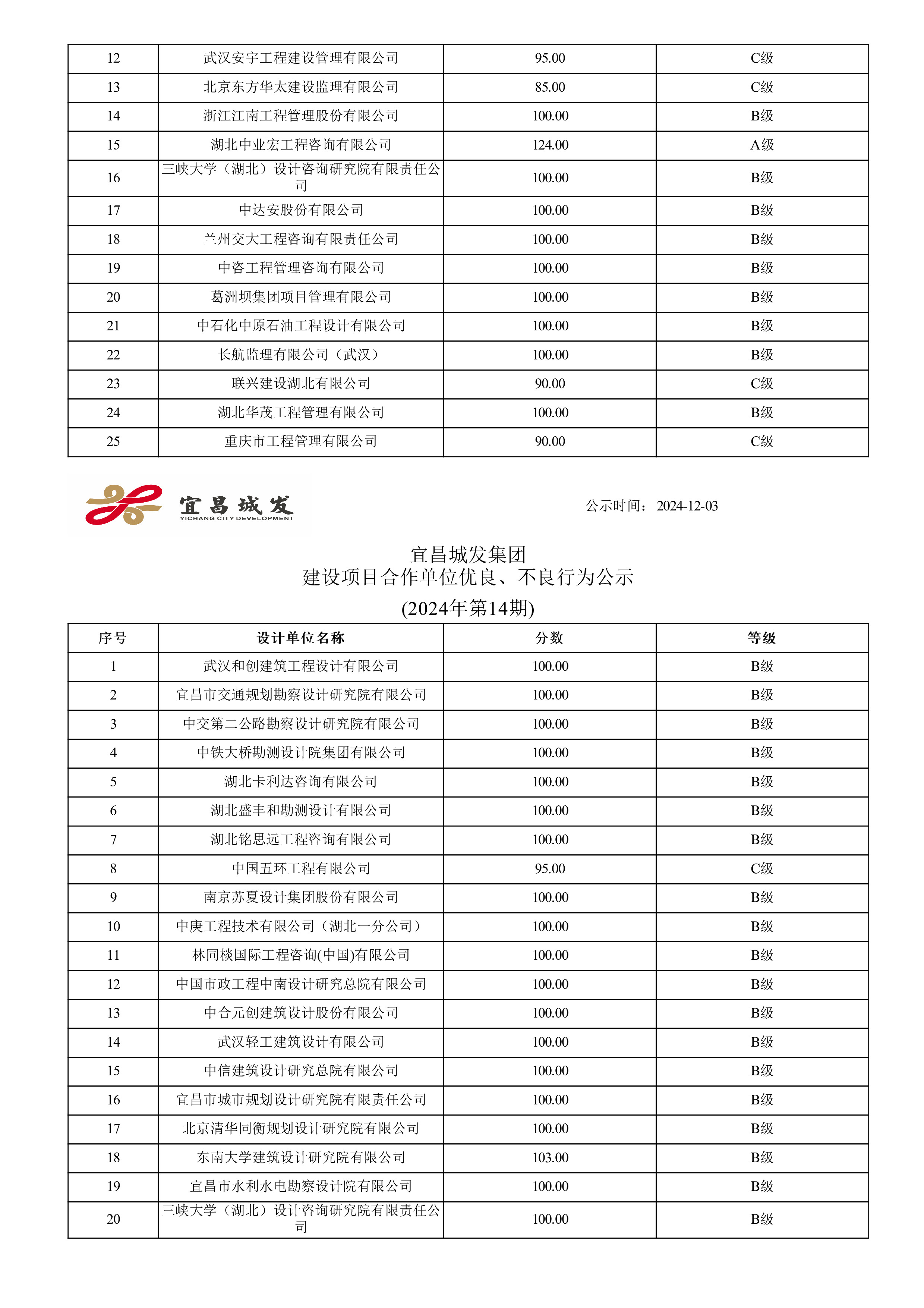 宜昌城发集团建设项目合作单位优良、不良行为公示 (2024年第十四期)