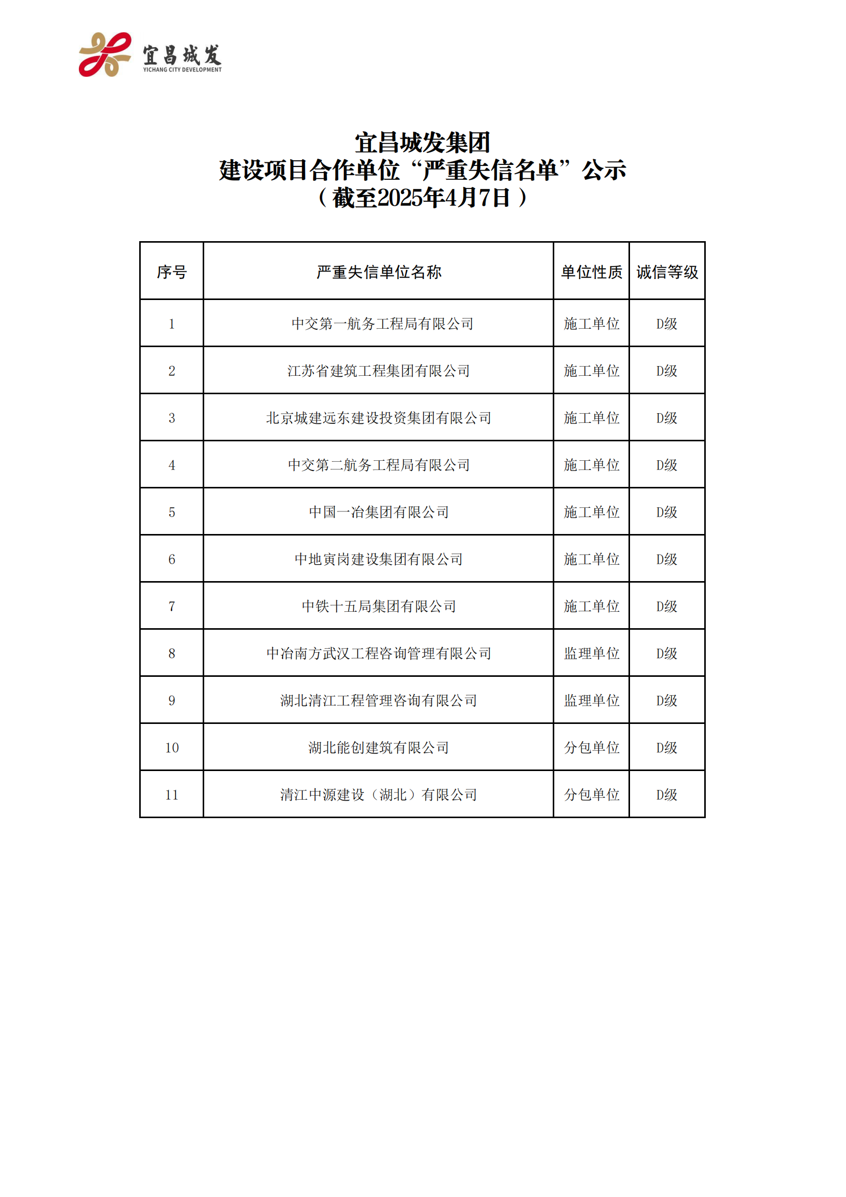 宜昌城发集团建设项目“严重失信名单“公示(截至2025年4月7日)