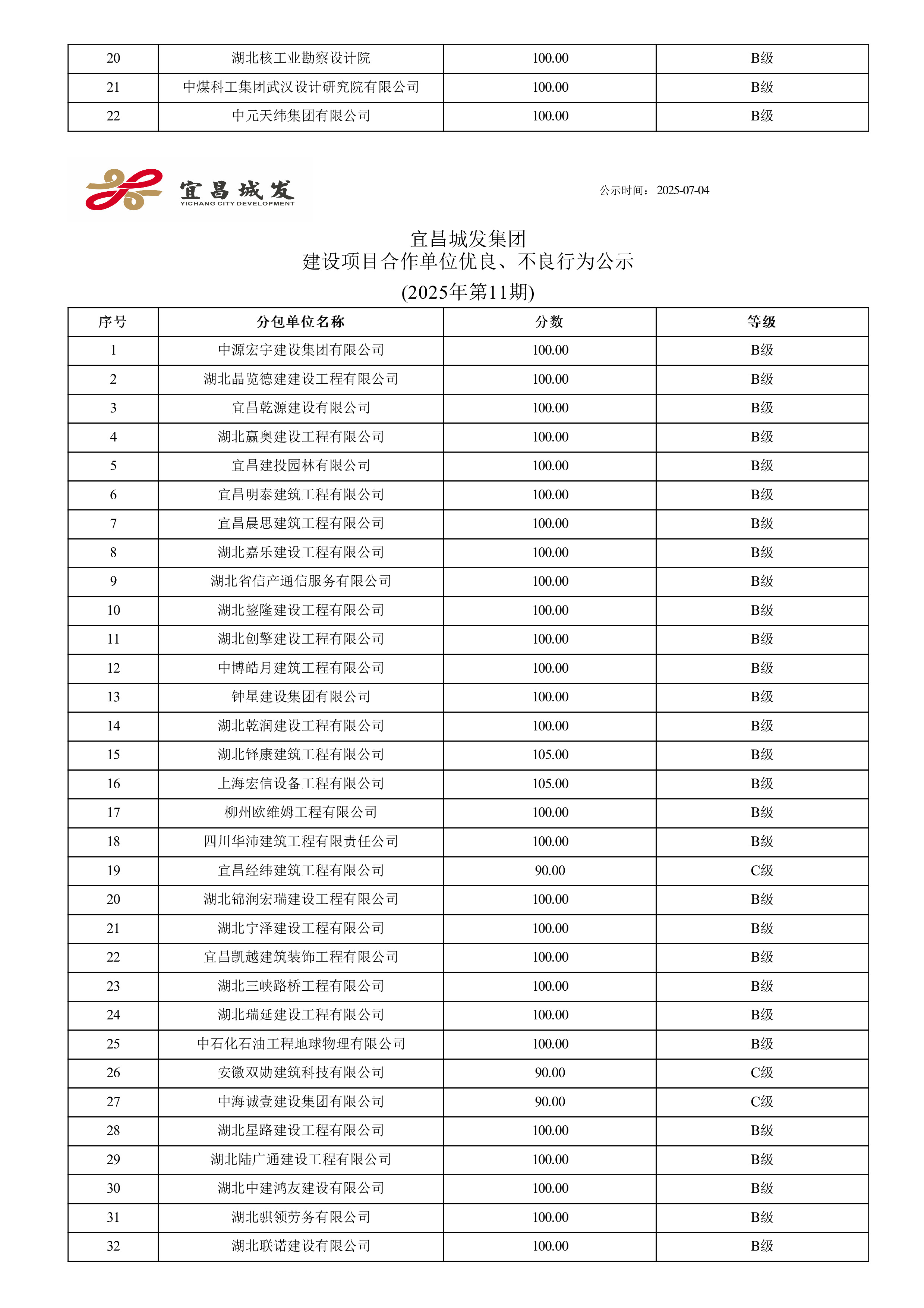 宜昌城发集团建设项目合作单位优良、不良行为公示 (2025年第二十七期)