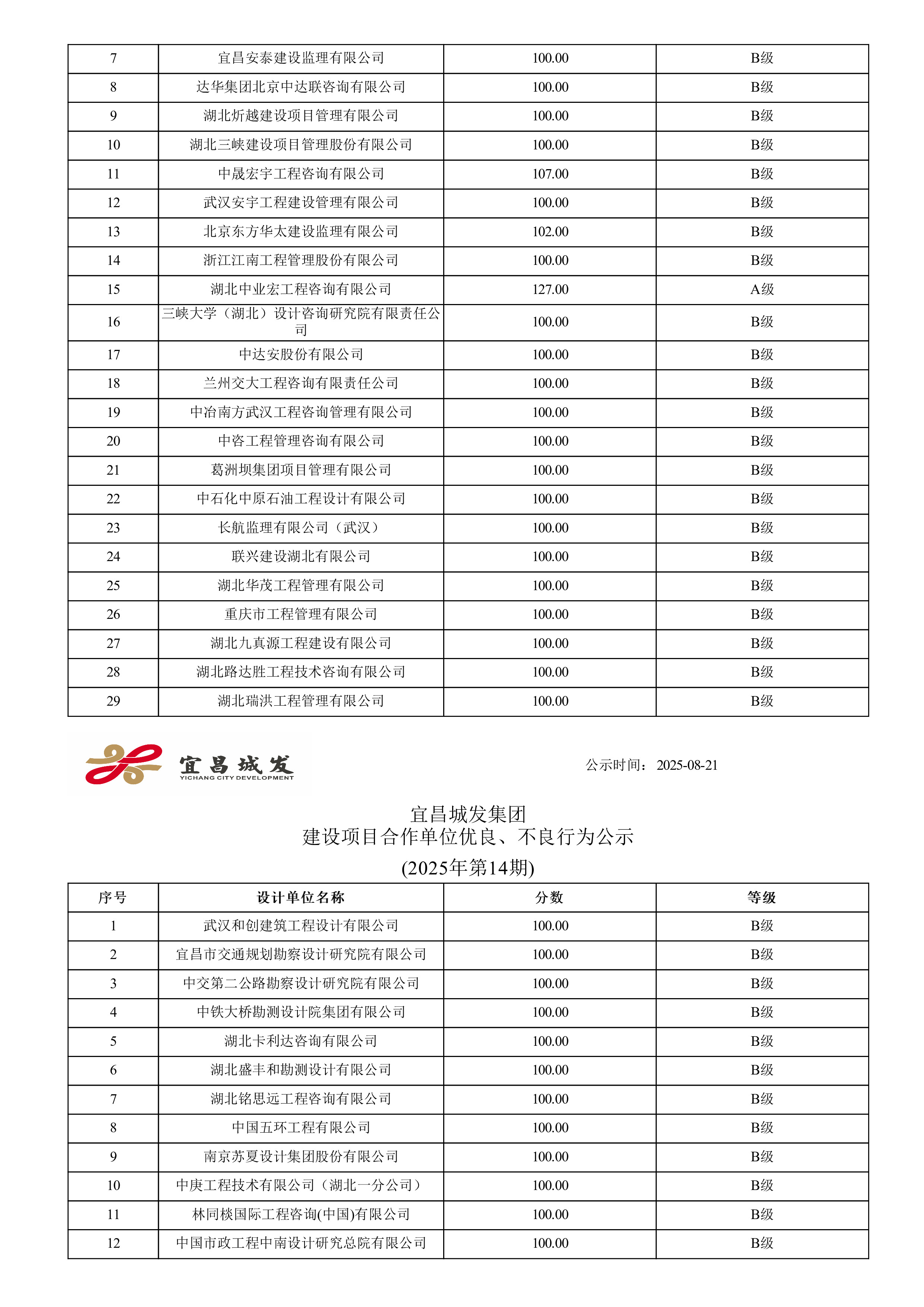 宜昌城发集团建设项目合作单位优良、不良行为公示 (2025年第三十期)