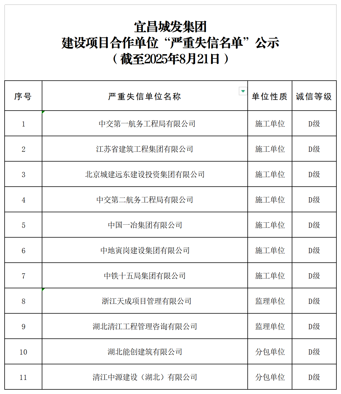 宜昌城发集团建设项目合作单位“严重失信名单”公示 (截至2025年8月21日)