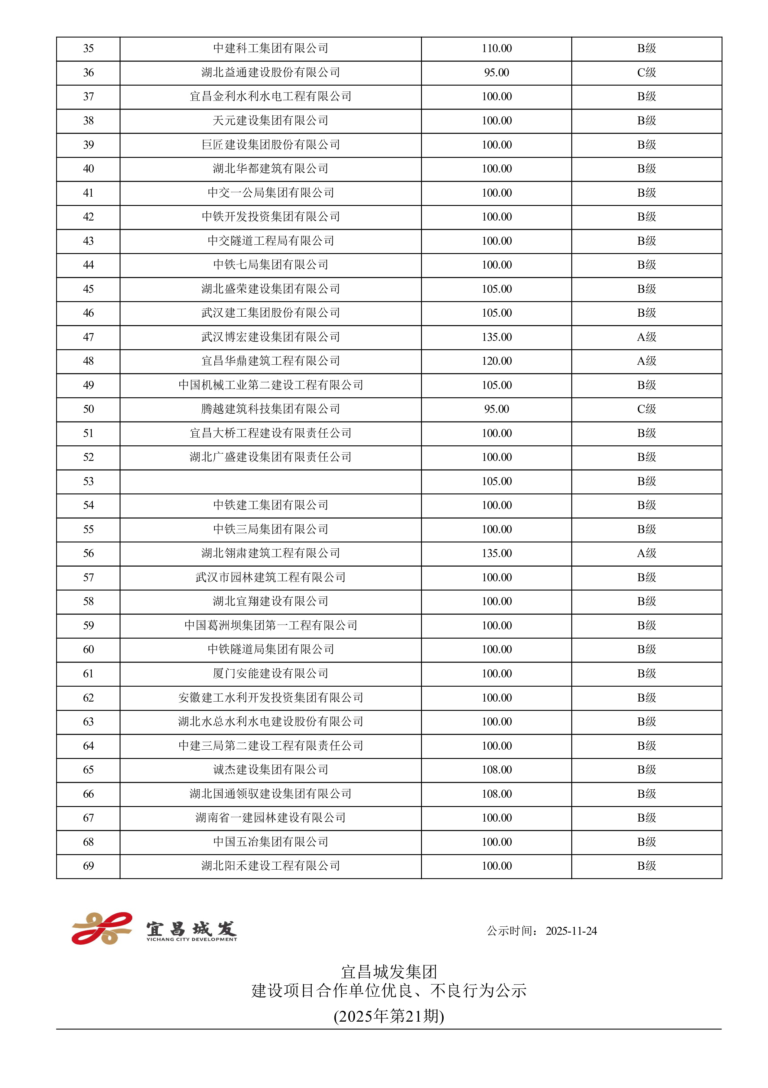 宜昌城发集团建设项目合作单位优良、不良行为公示 (2025年第三十八期)