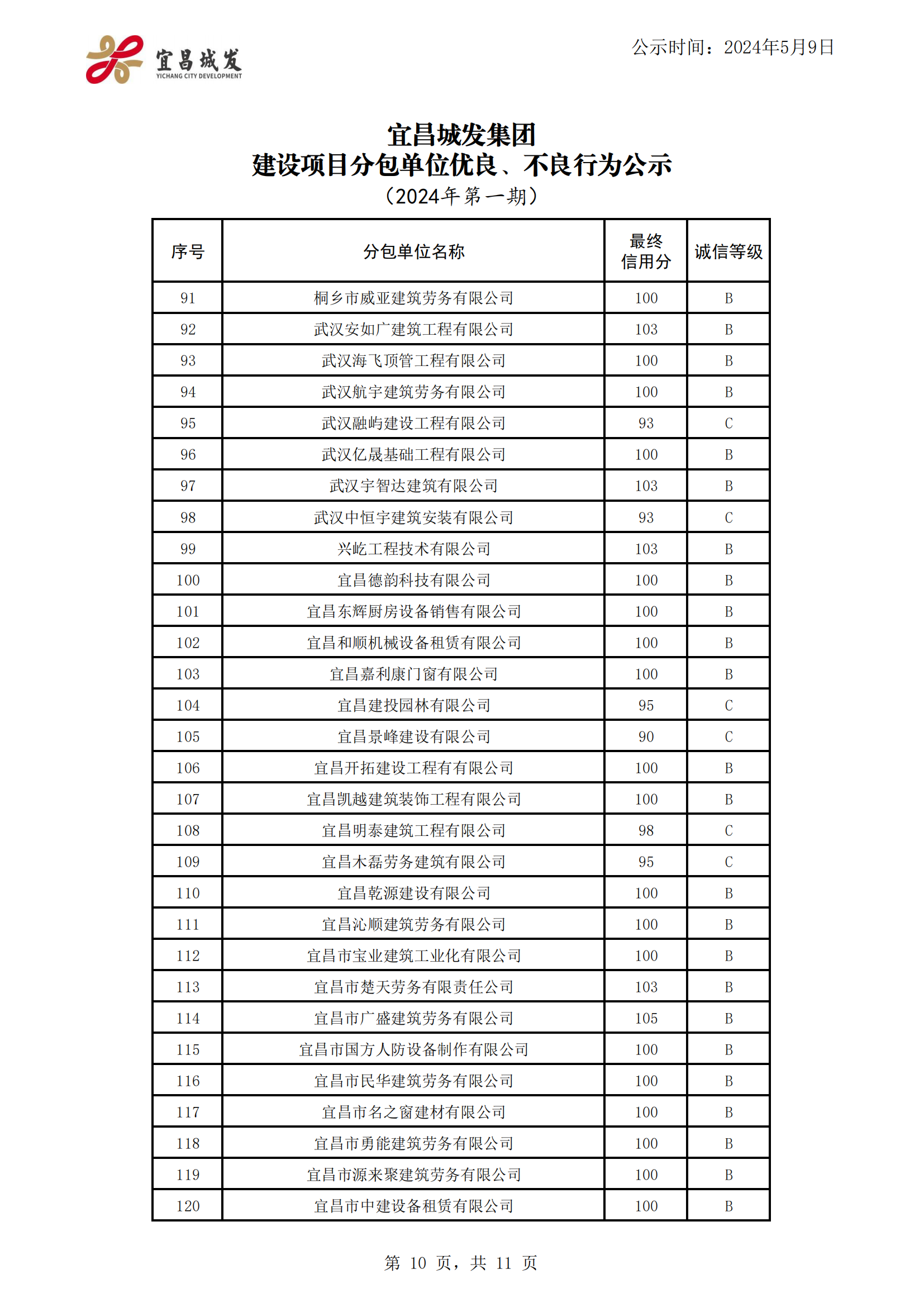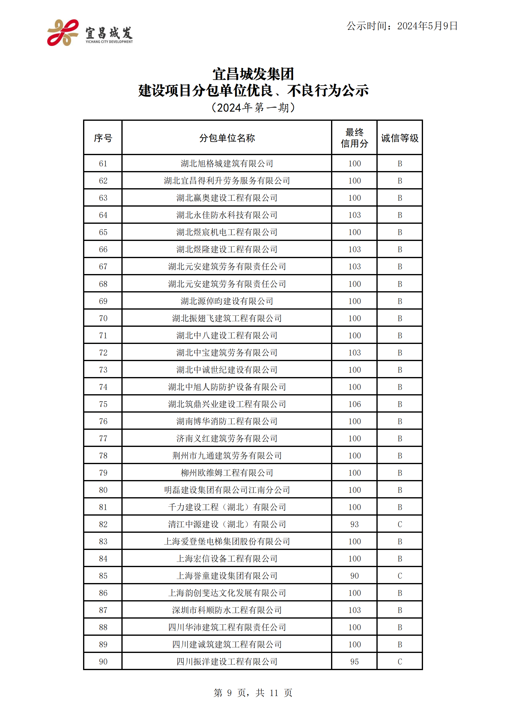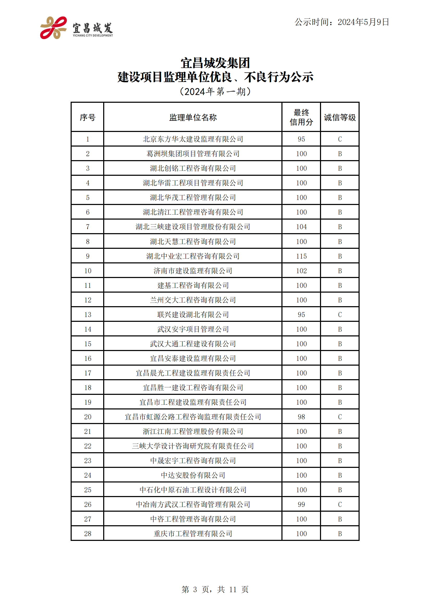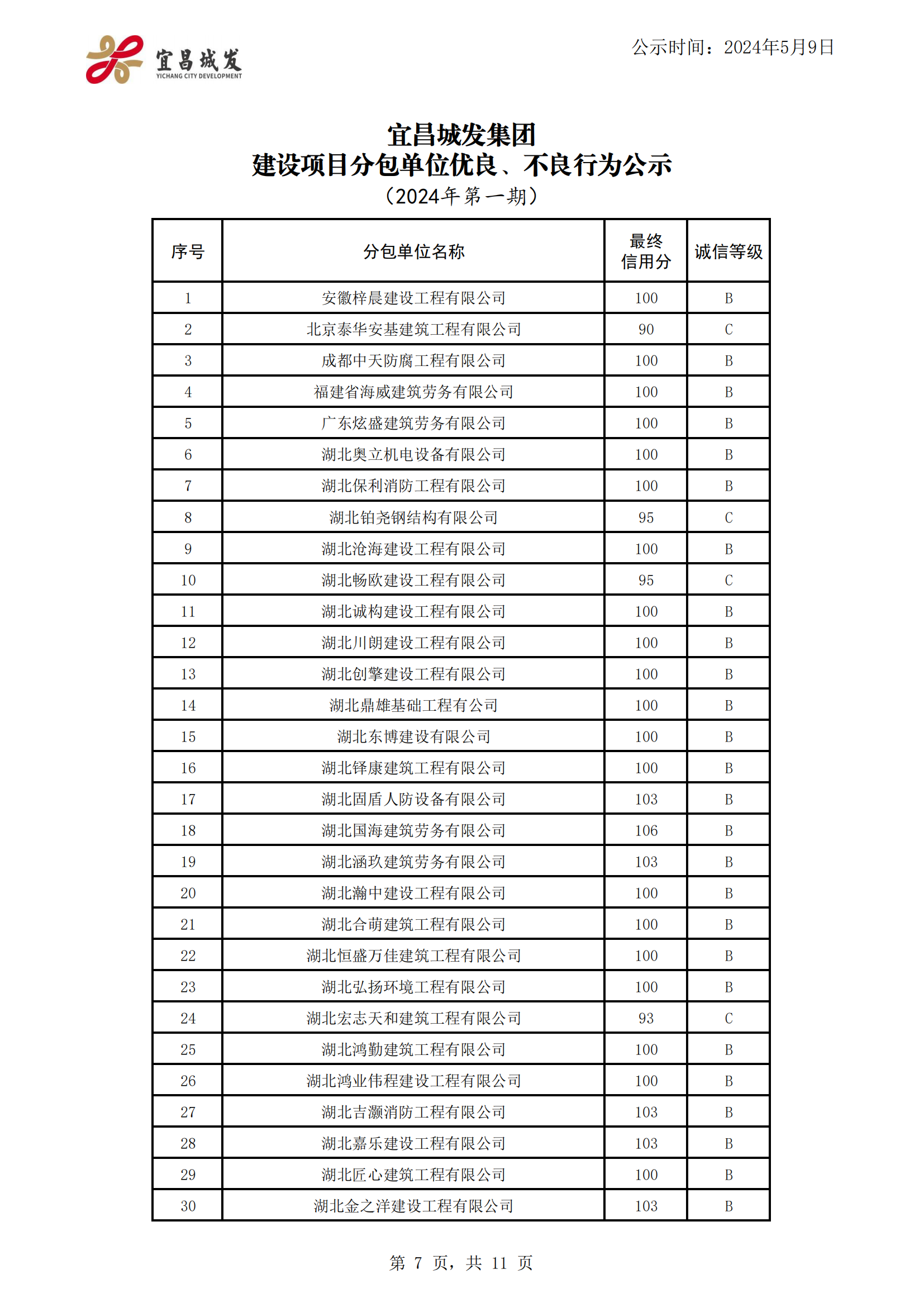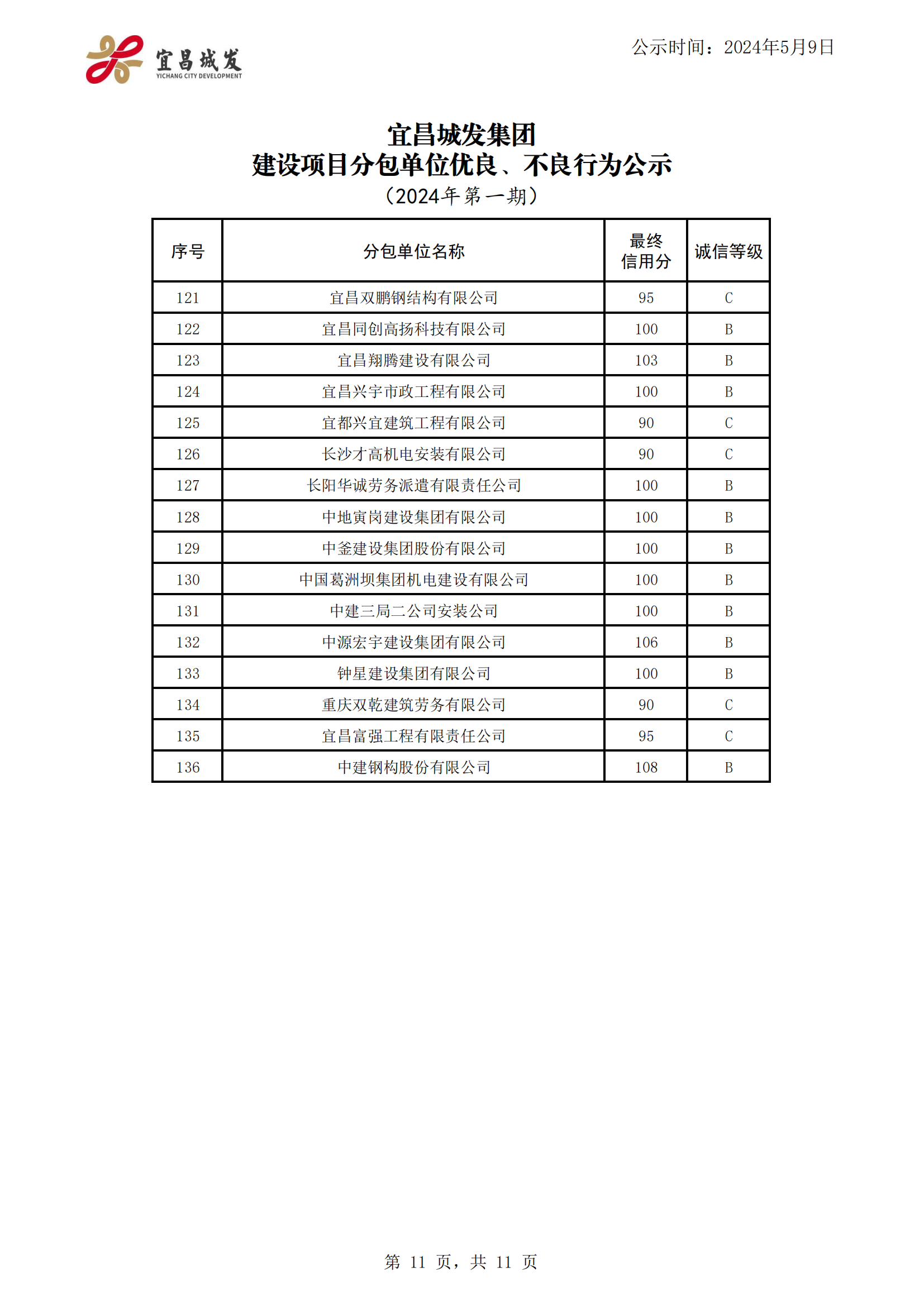 宜昌城发集团建设项目合作单位优良、不良行为公示 (2024年第一期)