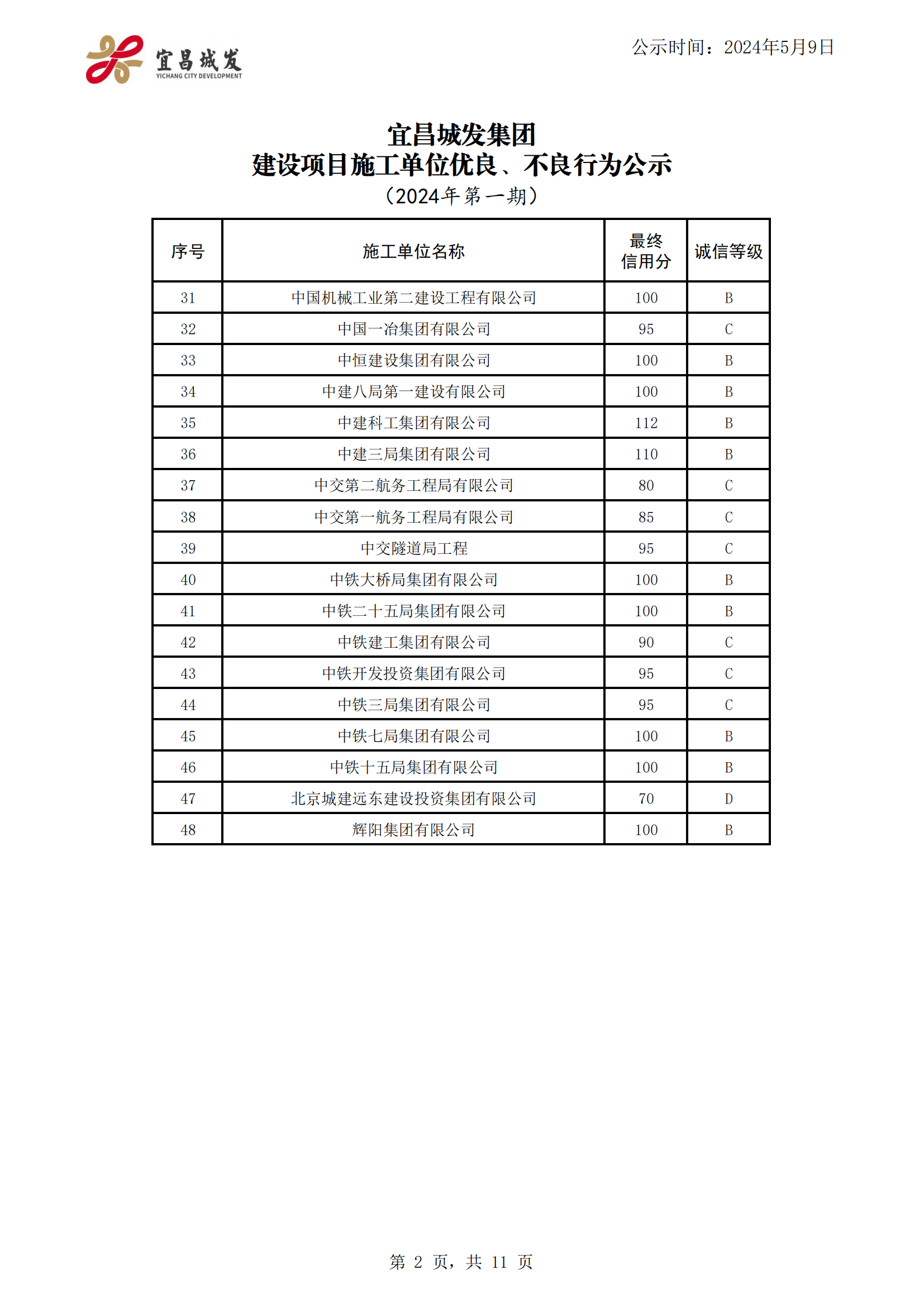 宜昌城发集团建设项目合作单位优良、不良行为公示 (2024年第二期)