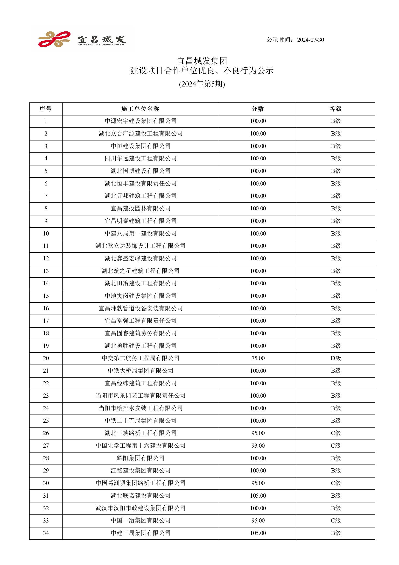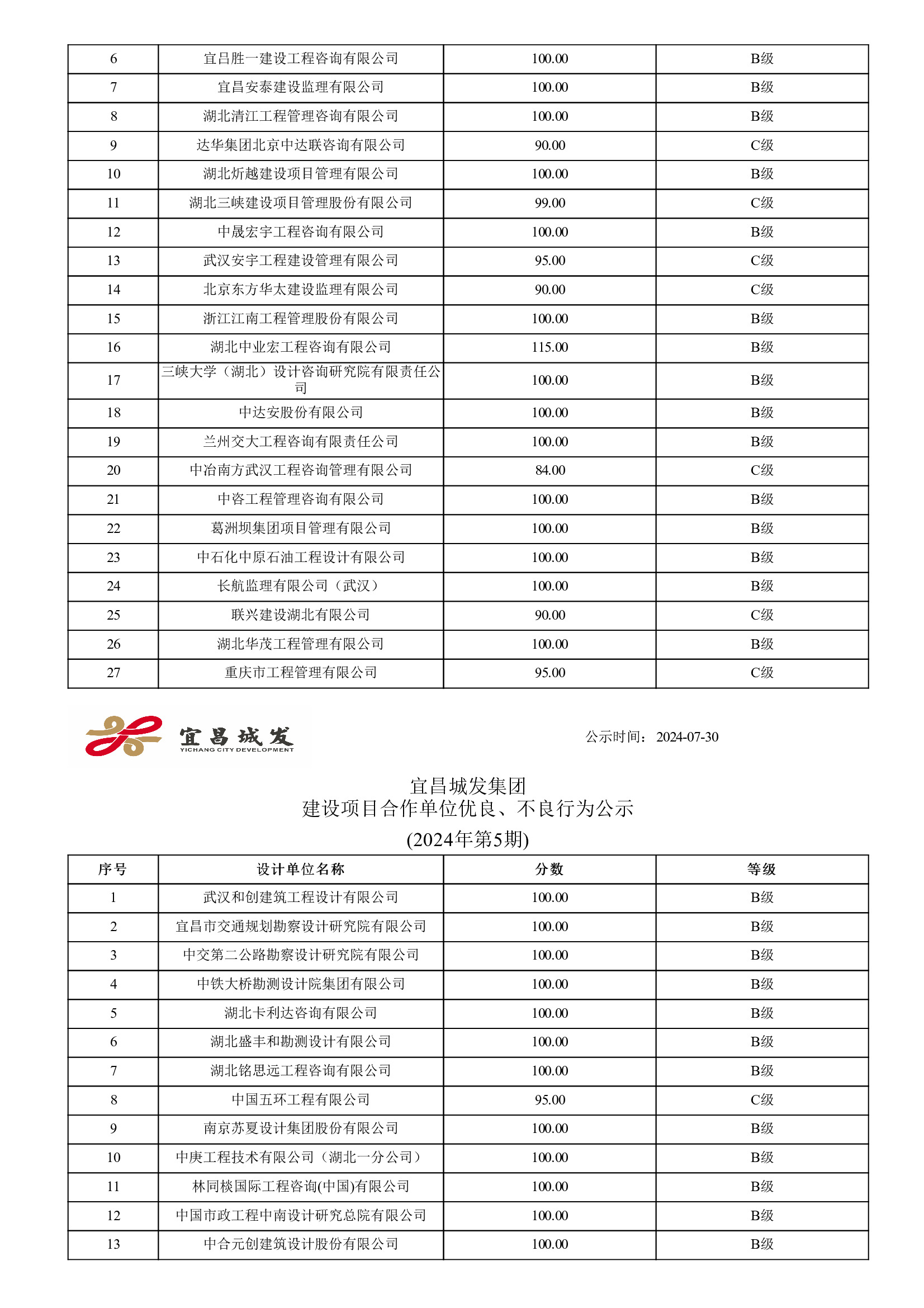 宜昌城发集团建设项目合作单位优良、不良行为公示 (2024年第五期)