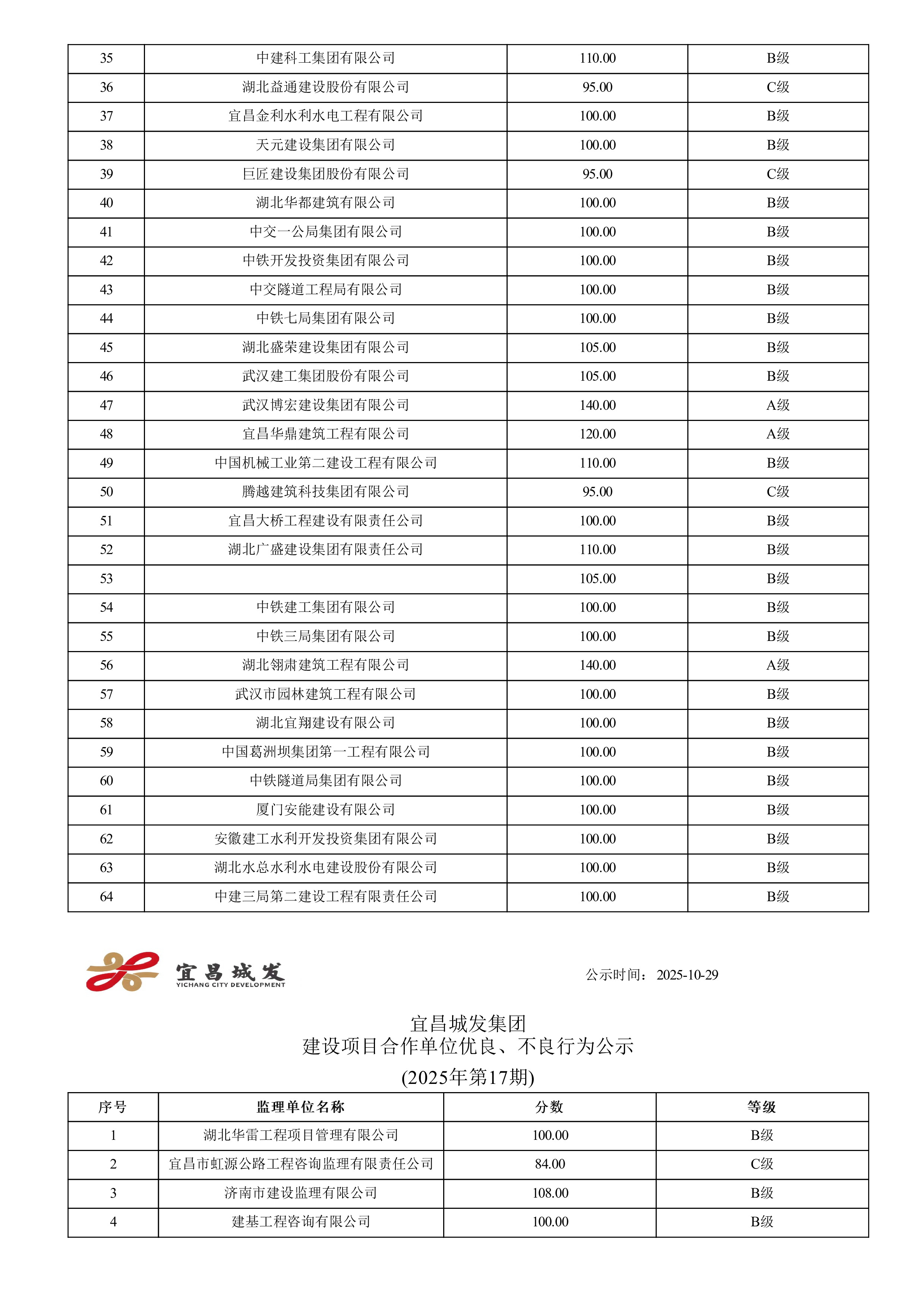宜昌城发集团建设项目合作单位优良、不良行为公示 (2025年第三十三期)